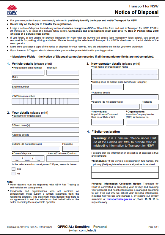 The Notice of Disposal is an important step when you are looking to sell or scrap your car in NSW. If you fail to submit a notice of disposal you are liable to face legal consequences.