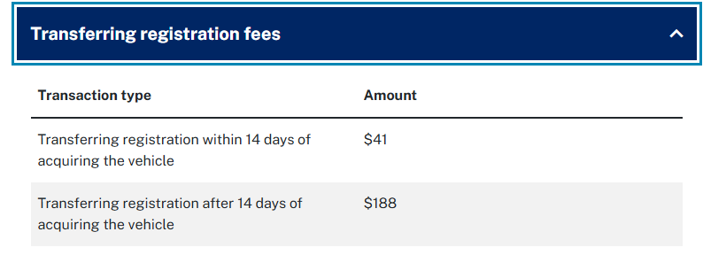 For buyers, you have to complete the transfer of vehicle registration (also called Rego) into their name within 14 days of purchase. If the buyer delays then they have to pay a late fee of $188. Now, if you register on time i.e., within 14 days the transfer fee will only cost you $41.