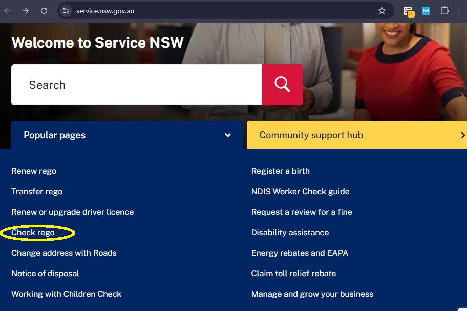 Step 1: Visit the official Service NSW website and on its homepage, click on the Check rego option.